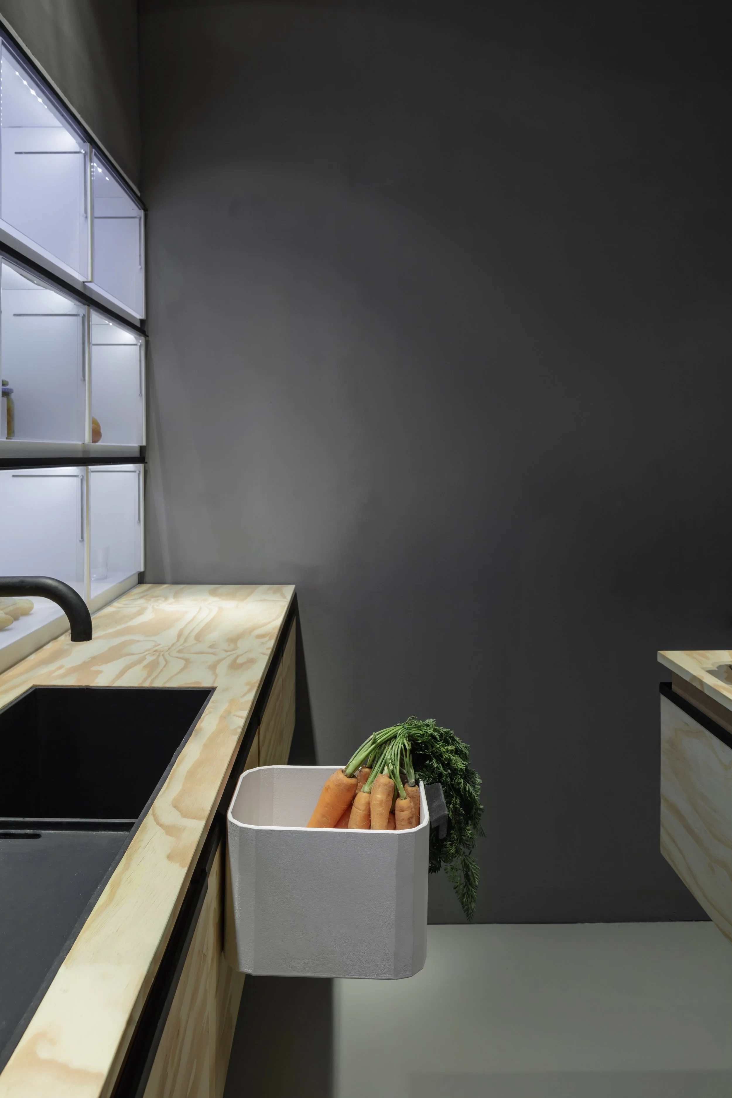 Das COMFORT.ABLE ist ein Küchen- und Kochkonzept, das sich an die vorgegebene Zielgruppe, bestehend aus drei älteren Personen, die in einer Wohngemeinschaft leben, richtet. Der erarbeitete Entwurf sieht drei verschiedene Areale vor. Das Präsentationsareal bietet sich in Form eines flächigen Kühlschranks dar, der die sichtbare Inszenierung der Lebensmittel und dadurch eine hohe Übersichtlichkeit garantiert. Das Areal der Kochutensilien in Küchenblöcken ist in Schubladen mit einer geringen Tiefe vorzufinden, wodurch ein mühsames Absinken des Körperschwerpunktes vermieden wird. Das dritte Areal, das Produktionsareal, manifestiert sich in drei Zubereitungsbehältern, die beliebig an den Küchenblöcken, im Waschbecken oder am Kühlregal zur leichteren Handhabung und zur Maximierung der Arbeitsfläche arretiert werden können. Diese sind eine Pfanne zum Braten, ein Topf zum Kochen und ein Sieb zum Abgießen. Eine weitere Besonderheit zur Arbeitserleichterung bietet die Funktion einer in die Kochstelle in der Mittelkonsole integrierten Bewässerungsanlage, sodass das Manövrieren mit schweren, mit Wasser befüllten Behältern obsolet wird. So kann beispielsweise im Rahmen des Comfort.able altersgerecht der Topf direkt auf der Kochstelle mit dem Nudelwasser befüllt werden.